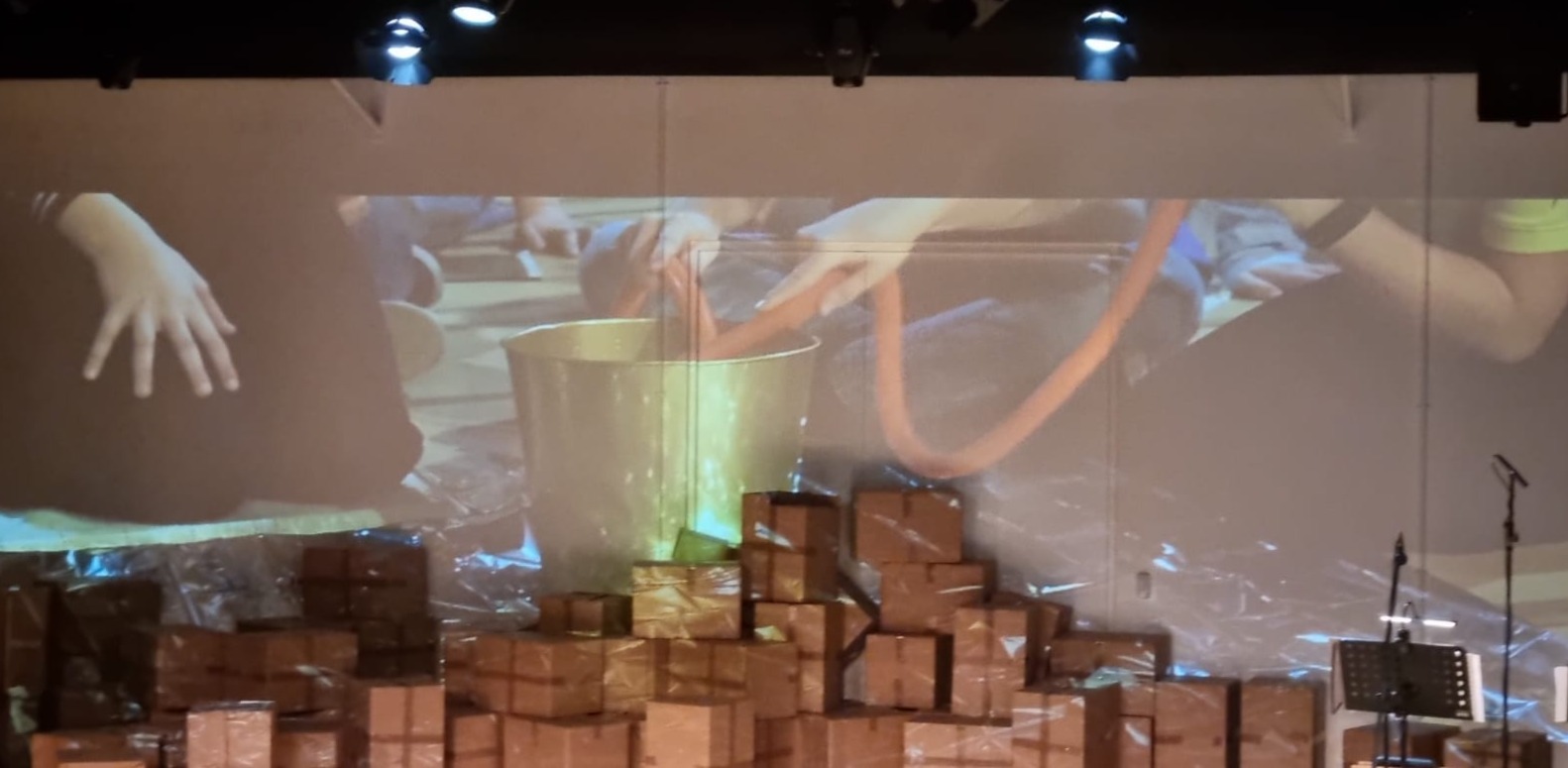 Das Bühnenbild entwickelte sich dabei direkt in den Händen der Kinder: Aus zahlreichen Kisten bauten sie eine beeindruckende Stadtkulisse, die das Zentrum ihrer Performance bildete. Musikalisch brachten sie ihre eigenen Kompositionen zur Aufführung, wobei sie die Kisten nicht nur als architektonische Elemente, sondern auch als Klangkörper nutzten.